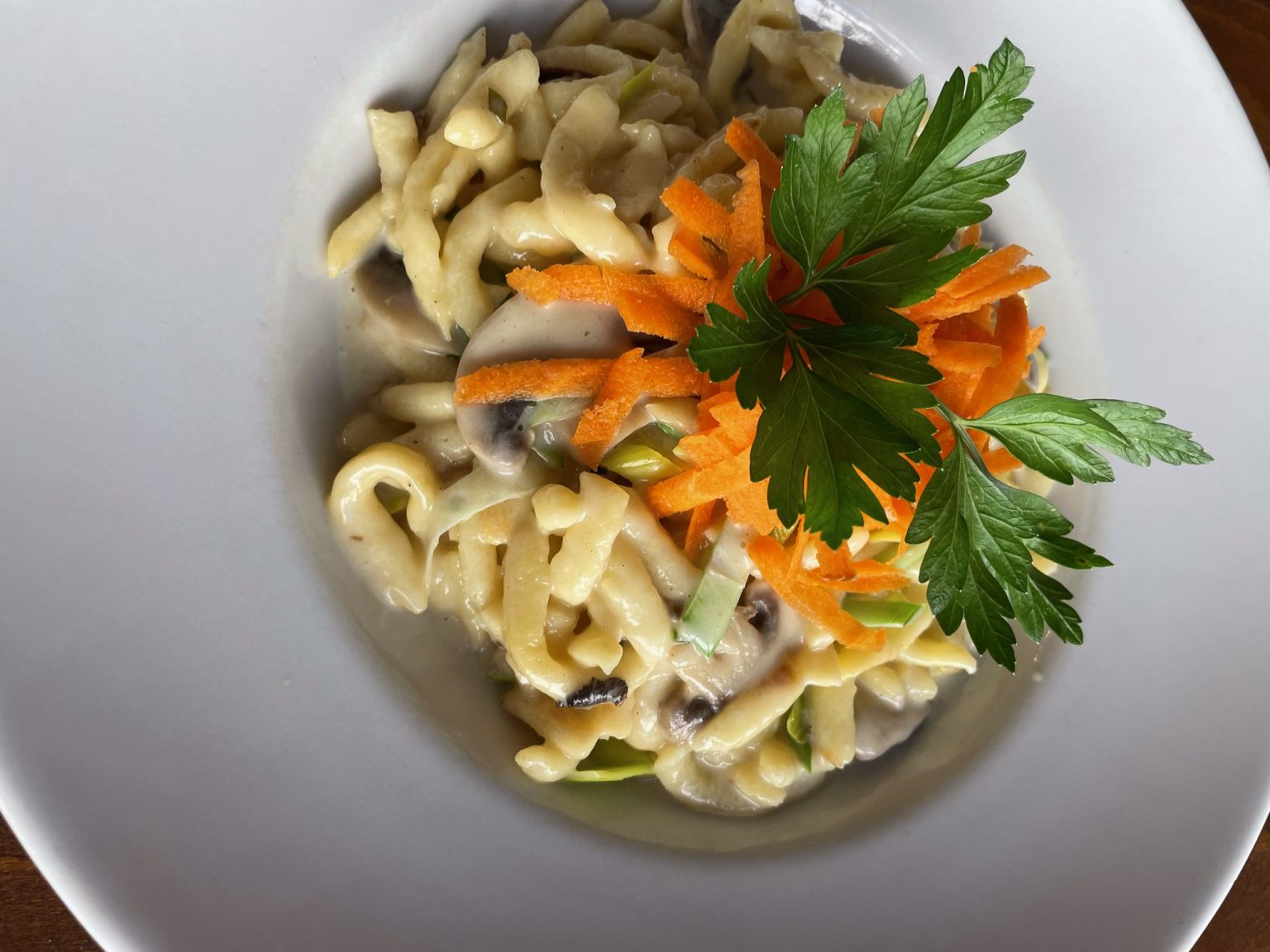 Gemischte Spätzlepfanne mit Champignons und Lauch in Kräuterrahm