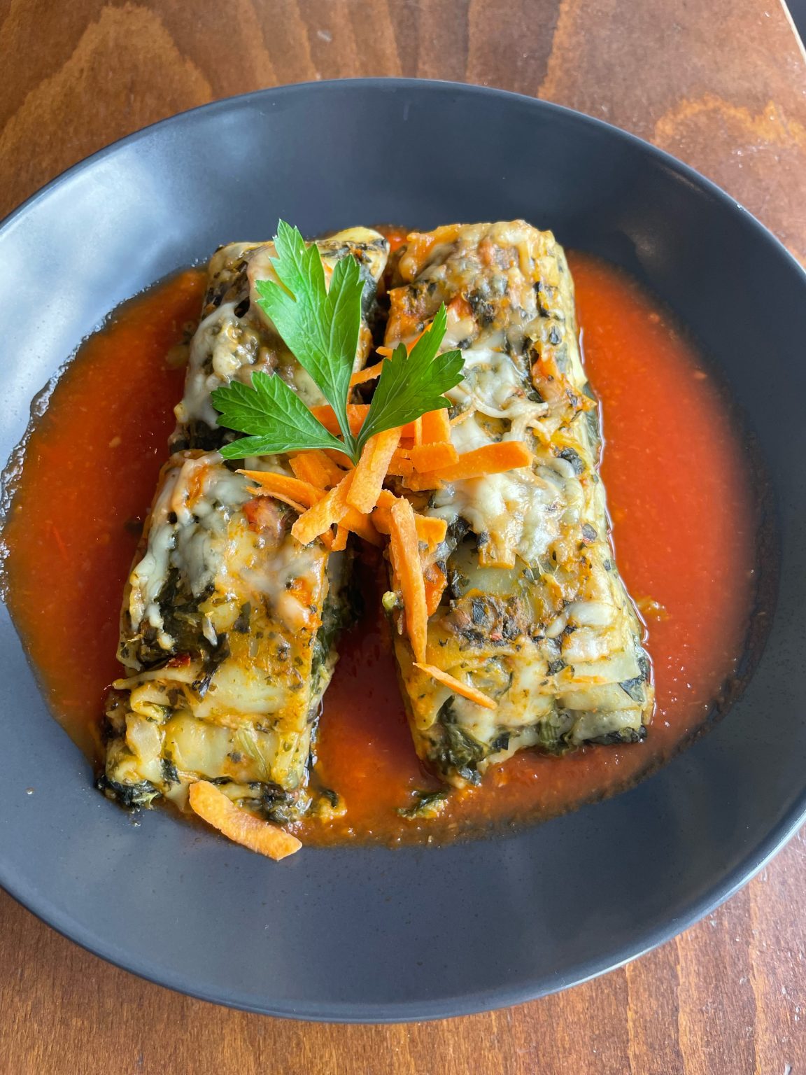 Spinat-Ricotta-Lasagne mit Tomatensauce und Käse überbacken