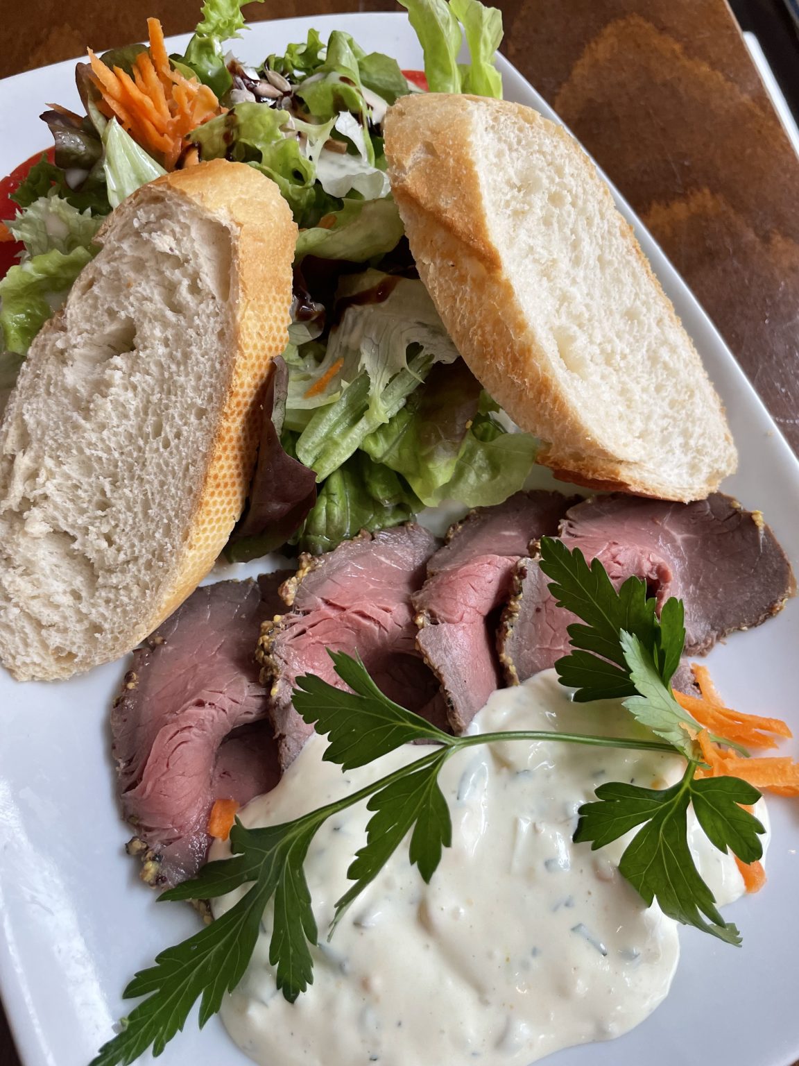 Roastbeefscheiben mit Kräuter-Remoulade an Salatbouquette und Baguette
