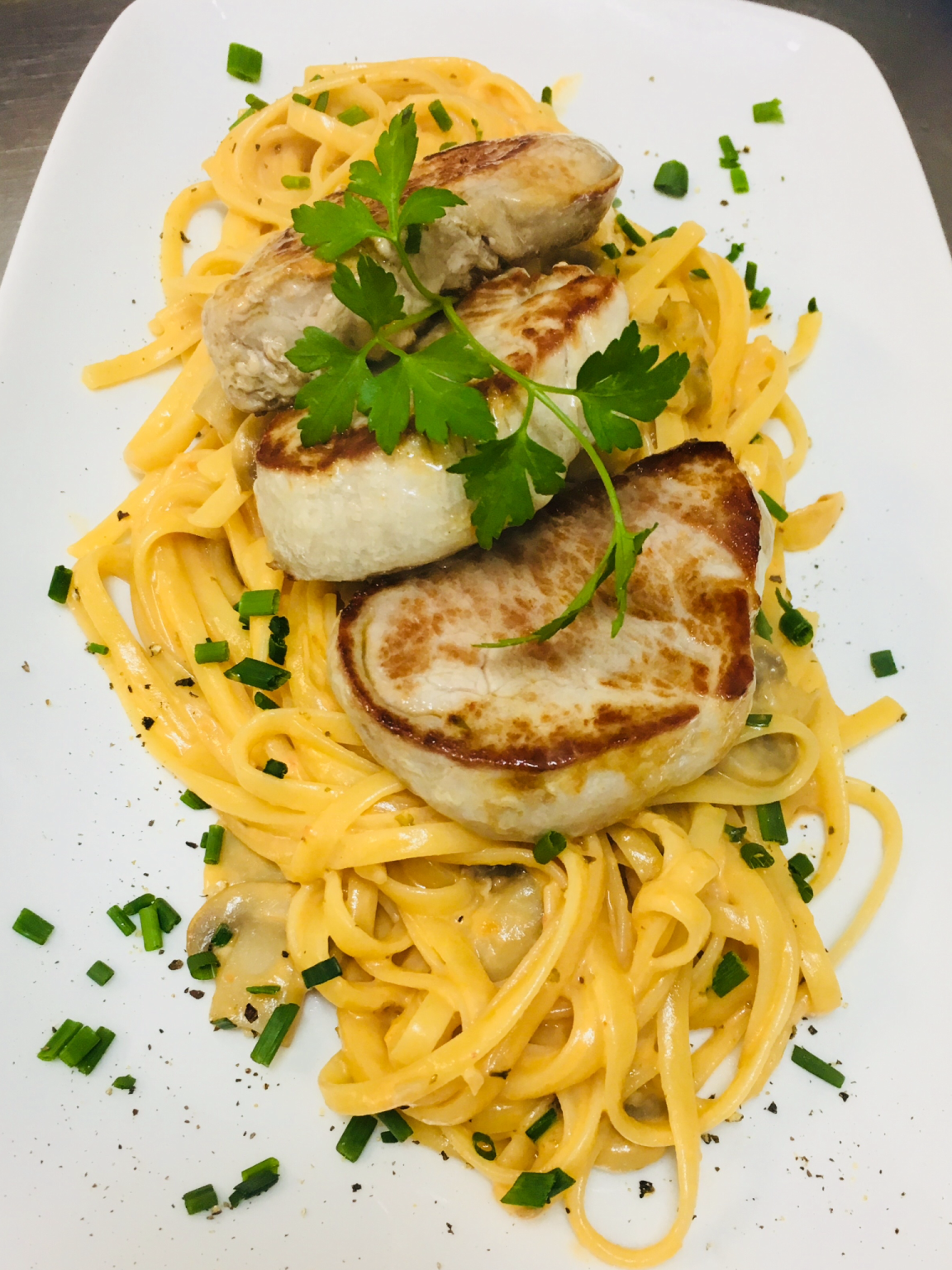 Gebratene Schweinemedaillons in Champignonrahmsauce auf Nudelnest