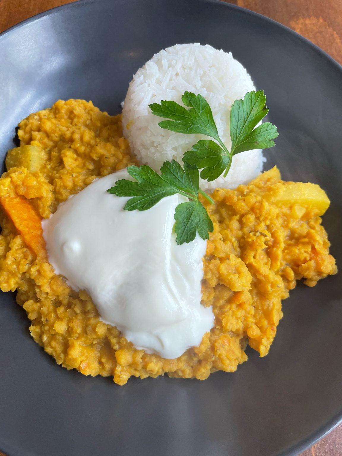 Rote-Linsen-Curry mit Karotte und Kokosmilch an Basmatireis